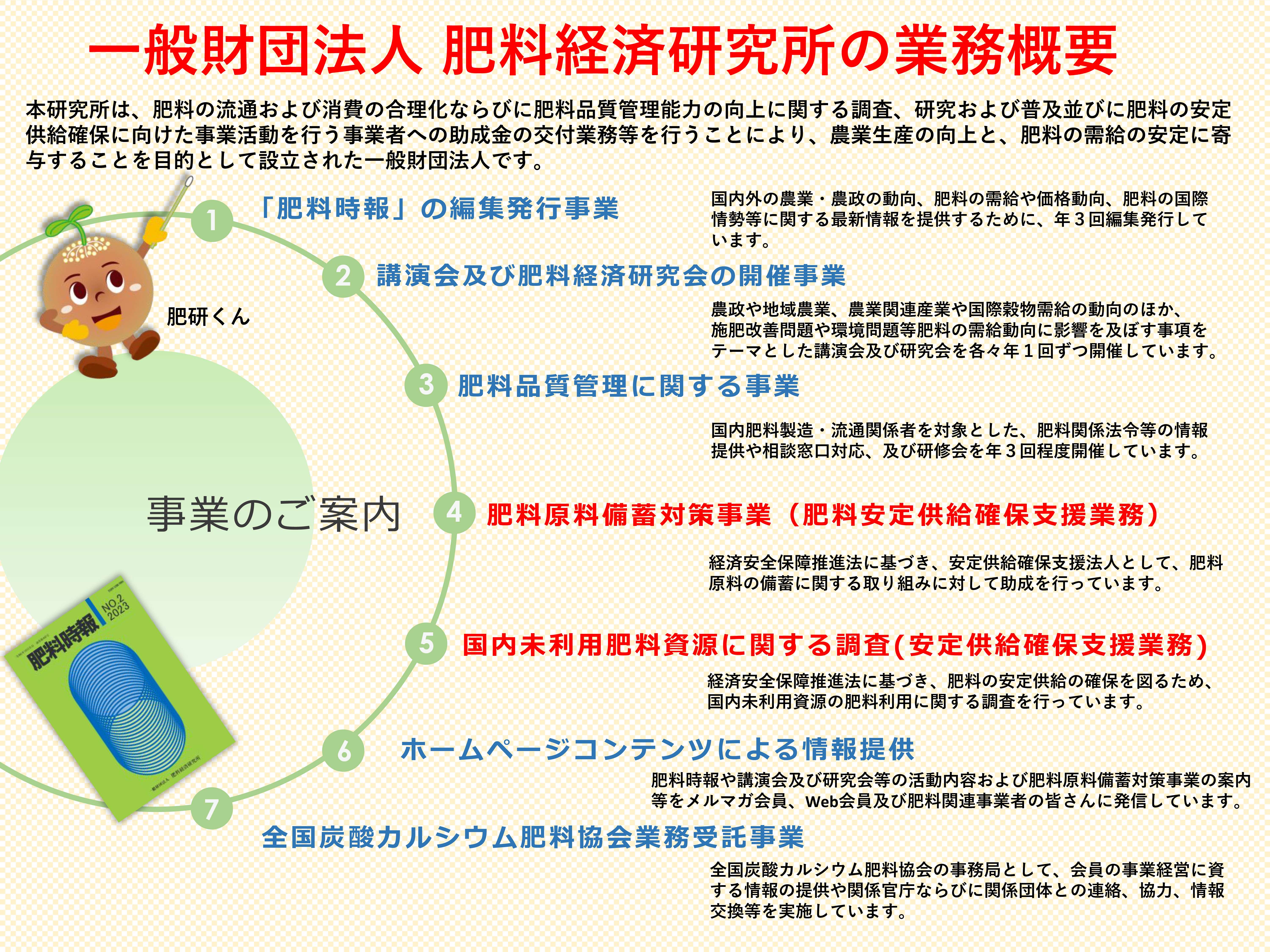 本研究所は、肥料の流通及び消費の合理化に関する調査、研究及び普及を行うことにより、農業生産の向上と肥料の需給の安定に寄与することを目的としています。